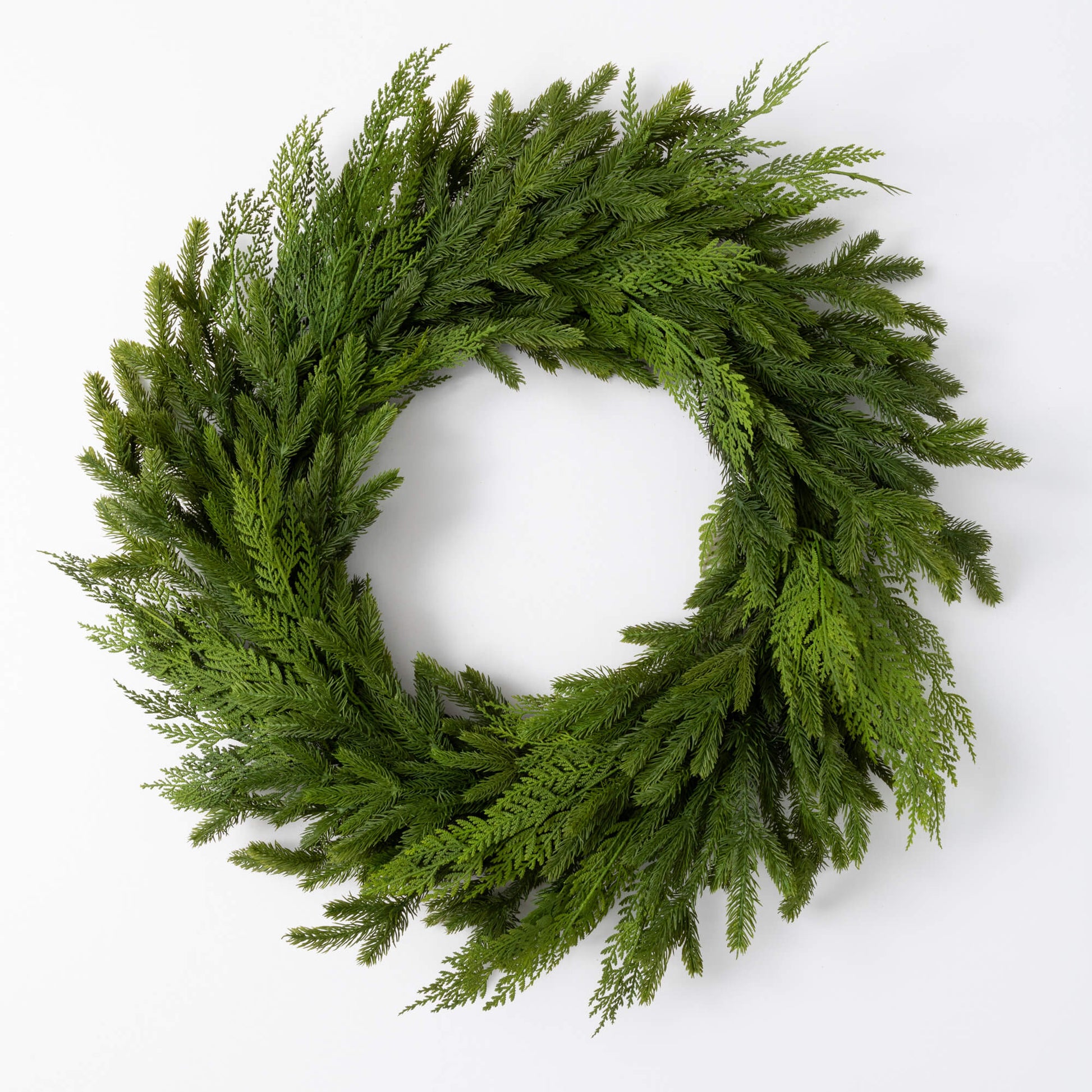 This lush cedar wreath features lifelike greenery arranged in a classic circular shape, perfect for adding a natural touch to your seasonal décor. The rich green tones and layered texture evoke the fresh, woodsy charm of real cedar branches. Ideal for doors, mantels, or walls, it brings timeless elegance to both holiday and year-round displays.