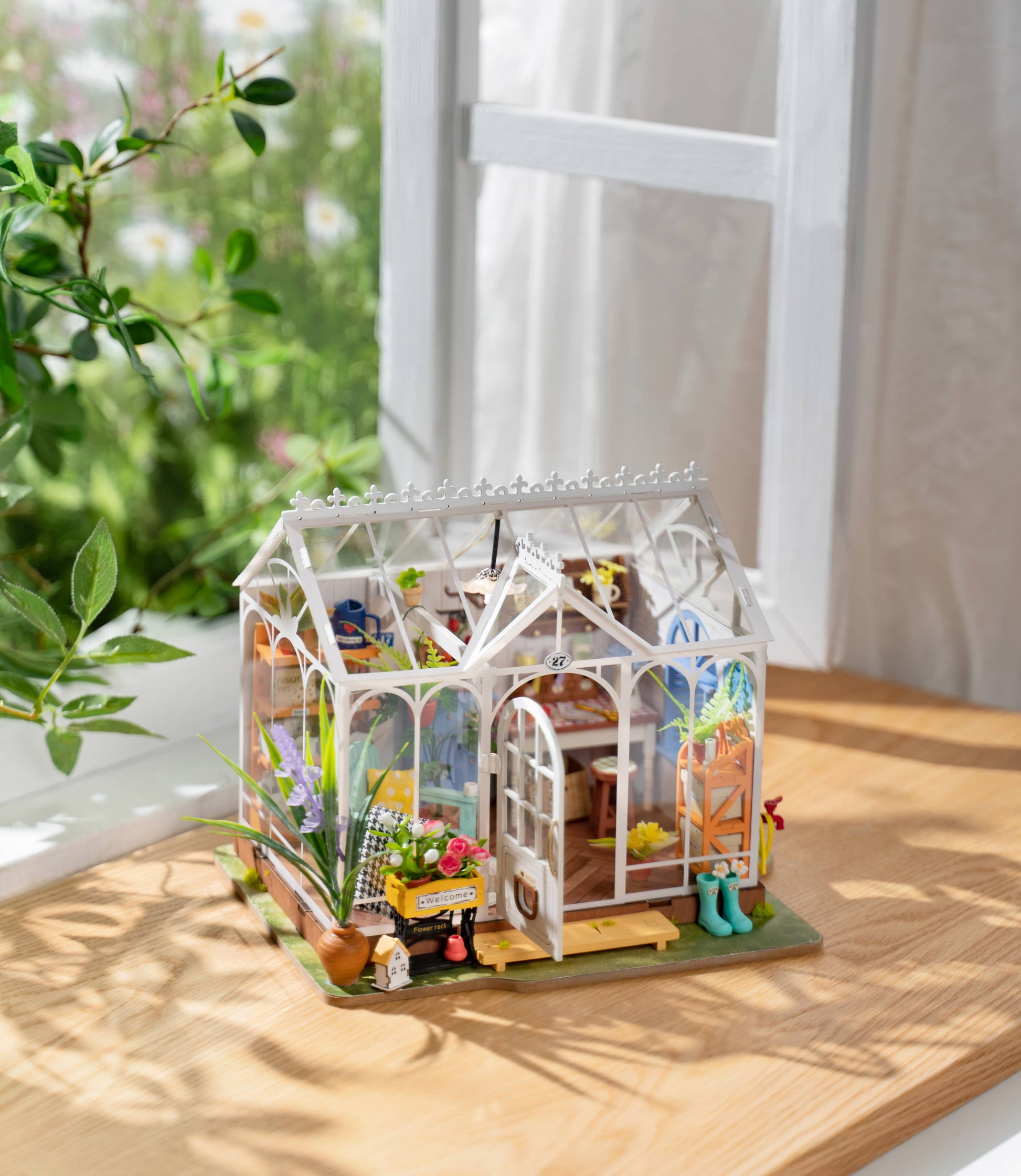 This miniature model room is designed with shelves, potted plants, flowers, vines, pots, gardening tools, and other details to create a well-furnished and detailed atmosphere. You can also add your own personal touch or flooring. The modern DIY greenhouse is an impressive accomplishment that will leave you feeling satisfied and proud of your work!