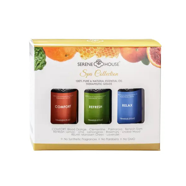 3 15ml bottles of 100% Natural Essential Oils Refresh Blend- Lemon, Lime, Lemongrass, Rosemary, Linaloe Wood Comfort Blend - Blood orange, Orange, Palmarosa, Benzoin Resinoid Relax Blend - Mandarin Green, Lavender No Animal Testing Bottled in the USA Child Proof Caps