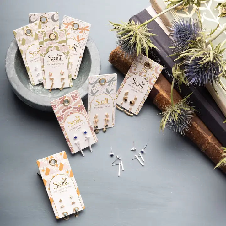 This versatile set of three stud earrings combines playful and timeless shapes, each dipped in 14k gold or sterling silver. Featuring interchangeable ear jacket backs, you can easily mix and match to create fresh looks or pair with other styles from the collection. Designed for versatility and comfort, these hypoallergenic earrings are always nickel- and cadmium-free.